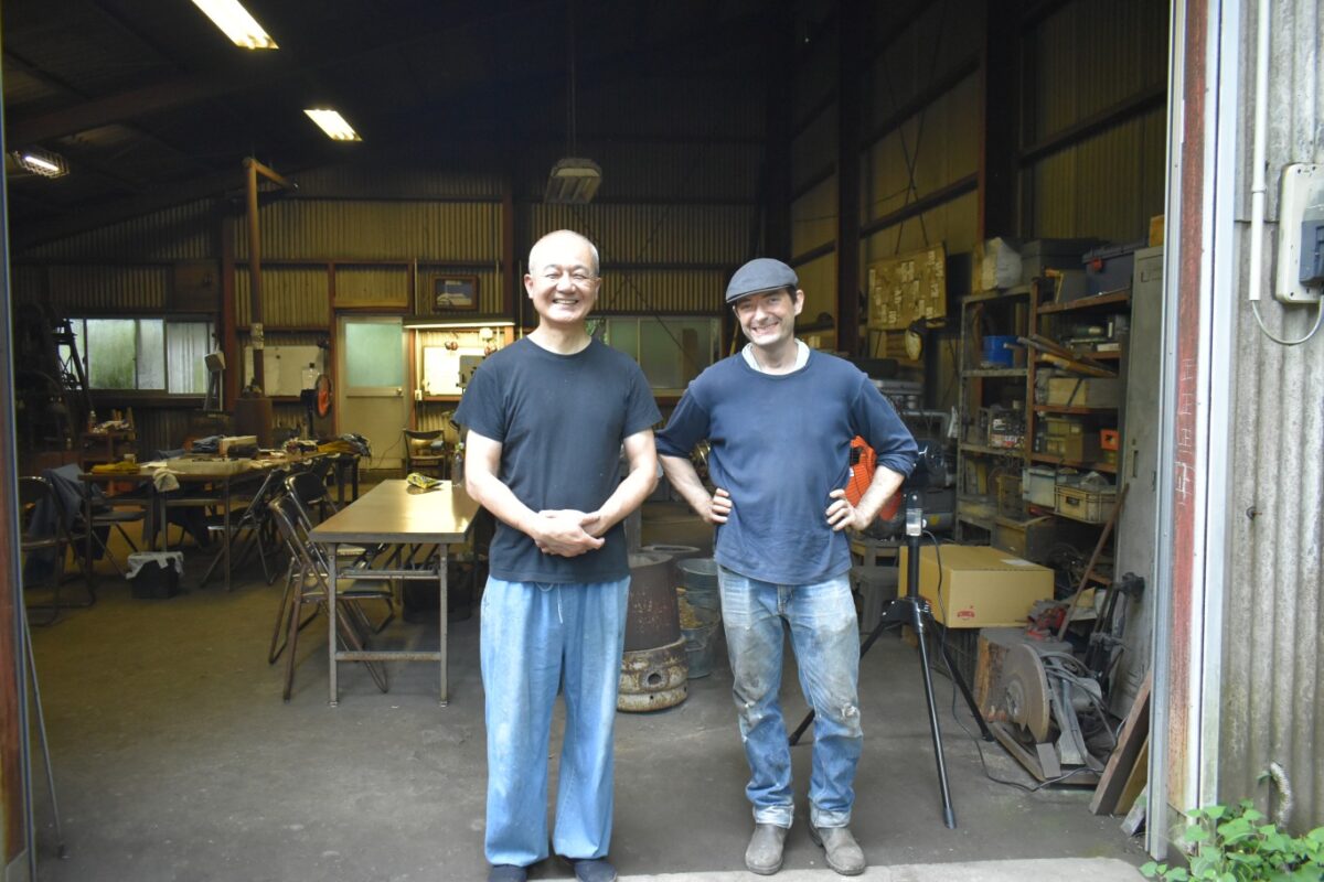 自然に囲まれた工房で、真っ赤に焼けた鉄に金槌を振り下ろして叩く作業からスタートです。